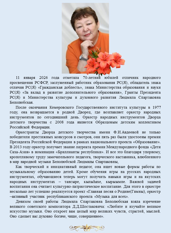 11 января 2026 года отметила 70-летний юбилей отличник народного просвещения РСФСР, заслуженный работник образования РС(Я), обладатель знака отличия РС(Я) «Гражданская доблесть», знака Министерства образования и науки РС(Я) «За вклад в развитие дополнительного образования», Гранты Президента РС(Я) и Министерства культуры и духовного развития Людмила Спартаковна Белолюбская.