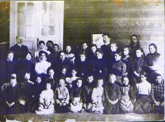 Городское 4-классное училище, 1909 год. 1 ряд сверху: попечитель Николай Ефимович Чепалов, учитель Ефимий Иванович Севастьянов, священник о. Иоан Харитонов, 2 ряд сверху: практикантки женской гимназии.