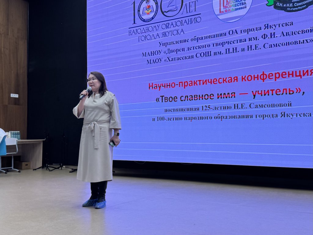 9 апреля прошла научно-практическая конференция «Твоё славное имя –учитель» в Хатасской средней школе, посвященная 125-летию Н.Е.Самсоновой и 100 -летию народного образования города. В конференции приняли участие делегации образовательных организаций, в том числе представители школьных музеев. Начальник Управления образования г.Якутска Мария Петровна Петрова выступила с приветственным словом, где сделала акцент на то, что семья П.Н. и Н.Е.Самсоновых-пример преданности педагогической профессии. В ходе конференции прошла панельная сессия «Культурно-историческое наследие:ценность, востребованность, развитие», где выступила Е.Д.Яковлева, заместитель директора МАНОУ ДДТ им.Ф.И.Авдеевой по теме: «Во имя детства и будущих поколений: сохранение памяти Ф.И.Авдеевой». Методисты ДДТ приняли участие на площадке педагогов НПСОШ№2 «Школа молодых педагогов: поколенческий подход». Музей истории развития образования г.Якутска предоставил для выставки редкие архивные документы о деятельности семьи Самсоновых и фотовыставку «История образования в фотографиях»